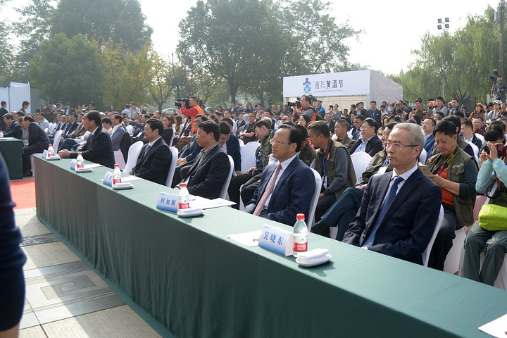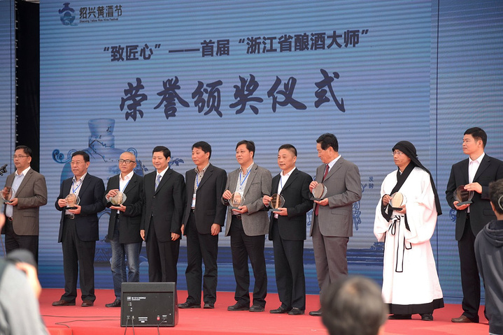 现场举行了隆重的开酿祭酒神仪式:五位酿酒大师率20位身穿汉服的黄酒使者步入主场,敬献黄酒五魂——水、米、药、曲、器。