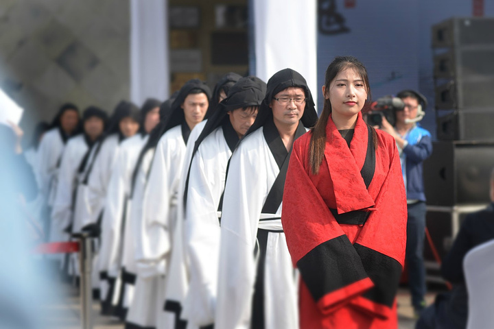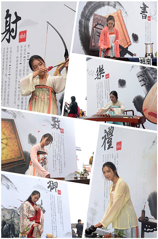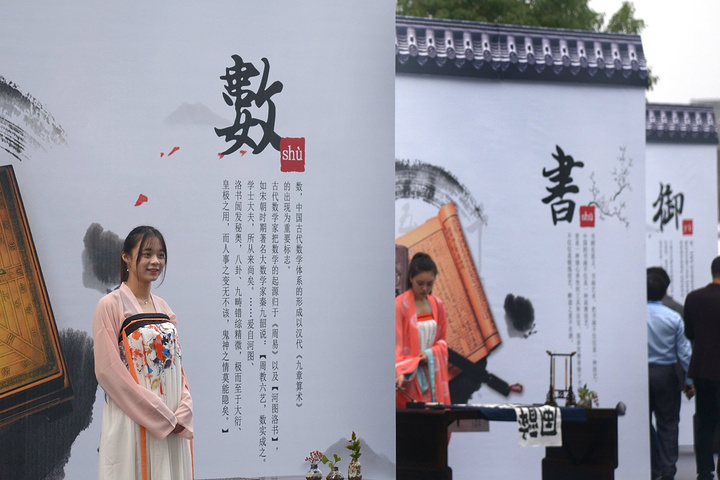 开幕式现场热闹非凡,入口出姑娘们着汉服分别演示着“礼、乐、射、御、书、数”六种周礼中传承的基本才能技艺。