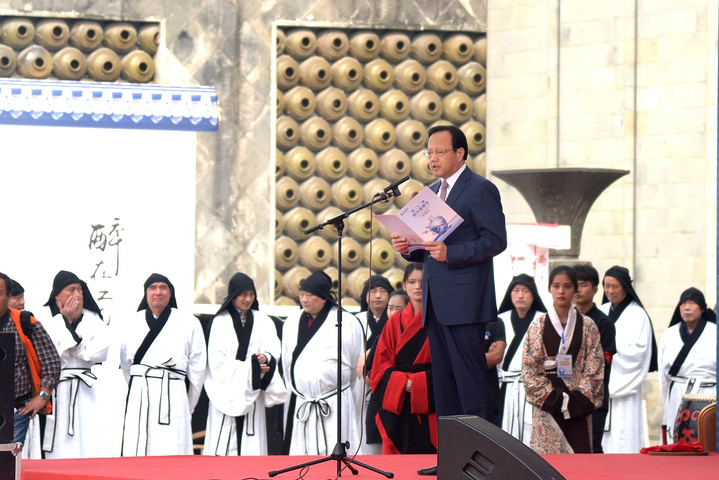 中国酒业协会黄酒分会理事长、绍兴市黄酒行业协会会长、中国绍兴黄酒集团董事长傅建伟诵读《祭酒神文》。