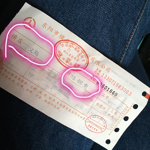 横店去义乌的汽车票,门口有携程旅行网的他们介意你网上买票扫一扫,便宜3块,总15,付了12,然后身份证去机器上打印汽车票很方便