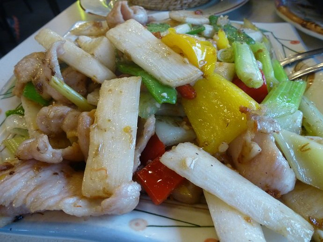 猪颈肉,很滑嫩的。里面的山药条尤其好吃