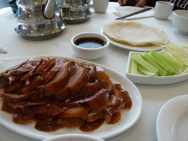 烤鸭可以点一份的。这一份不知道算是一只还是半只鸭子。他家的鸭子片法和其它北京烤鸭店的不一样。。。本人对烤鸭感情一般,所以也吃不出来好坏。自己觉得味道还可以。