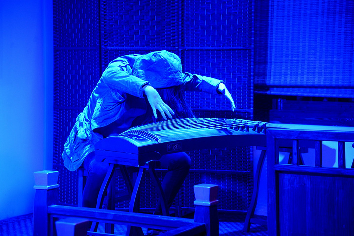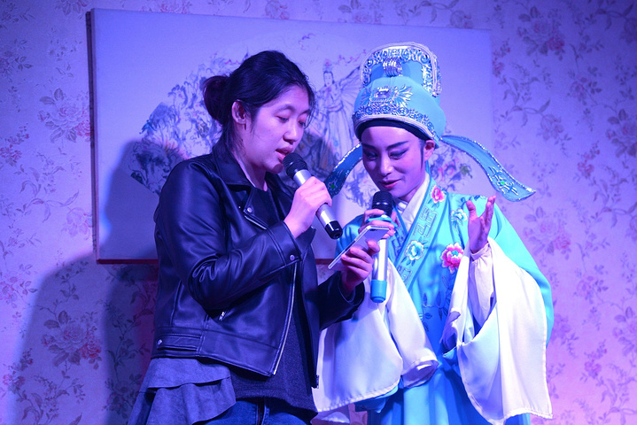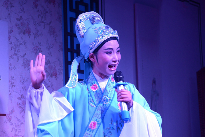 题扇阁楼上,一杯清茗几样茶点,演员走上舞台,表演着越剧名段。