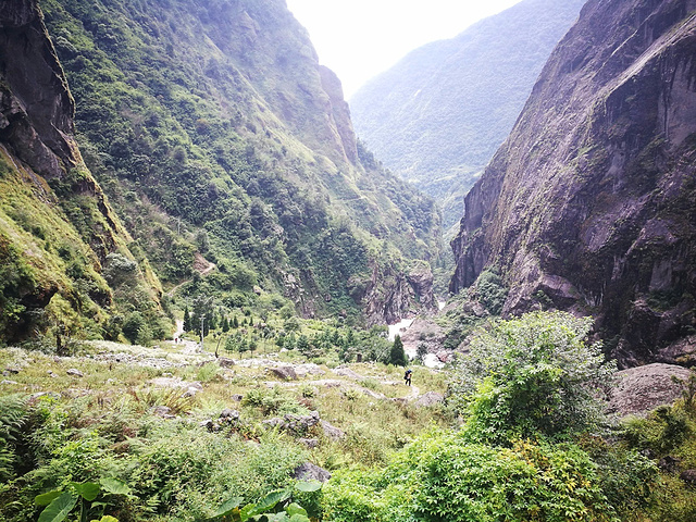 然而没过多久又是一段下降,下降到了河滩,也就是说刚刚路可能都白走了。。。这时候我几乎已经走到腿发抖了,因为眼前又是一段超长的石子路。。。这一段太累了所以完全没有拍照。。。总之呢我已经记不得是怎么走上去的了,只记得上去后就瘫倒到Teahouse前的木椅上了。。。老婆站起身拍了张刚刚走过的坡,几乎看不到路。。。照片还看不出来,在下面看真的很长很陡。