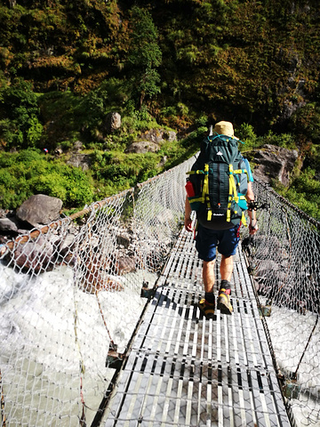 出了村子后是一段下坡,但是在大约1个小时左右后进行了一段爬升到达了Chamje,Chamje也是一个比较大的村子,我们在路边坐下休息,买了一瓶冰矿泉水,灌进保温瓶后投进了一片佳得乐的泡腾片,与先我们而来的印法三人组稍微聊了下后就继续出发了,在村中的行进依然是爬升,在村子尽头有两条路,一条是大路继续上升,一条是右手边的小路下降,右边的小路有一个路牌写着“Way To Manang”,于是果断选择了徒步的小路,这是一长段下降,通过一座铁索桥时遇到了昨天的迪卡侬男: