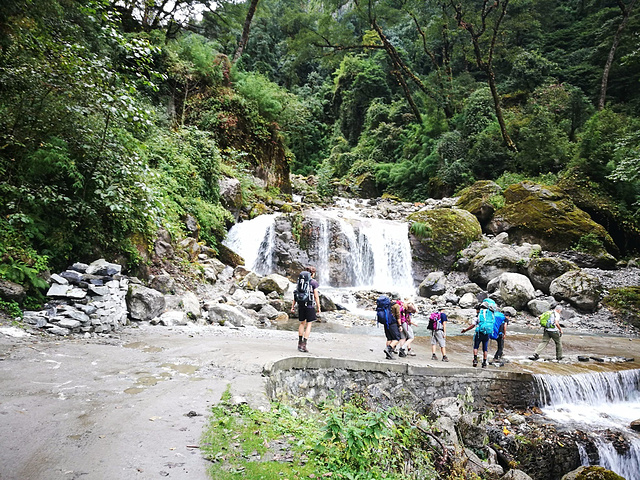 总之就是不断的爬升,然后到达了一个很大的平台,在这之前有一个非常陡峭的爬升,这里必须要尽快地爬,因为没有歇脚之处比较危险,上来后这里有一个Teahouse,几乎所有人都在这里休息,包括之前见到的韩国二人组,我们也在这卸包休整,买了一瓶水,在这里的水价已经涨到160卢比了。灌了这里的泉水加了事先买好的净水片,但发现漂白粉味儿太浓,没法喝。