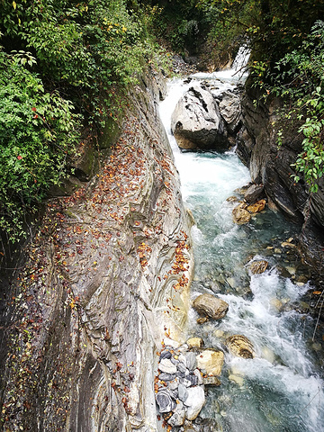 走不多久就进了树林,踩着长满青苔的石阶不断爬升,再不久就遇到一条“水路”,很多人在这里排队过河