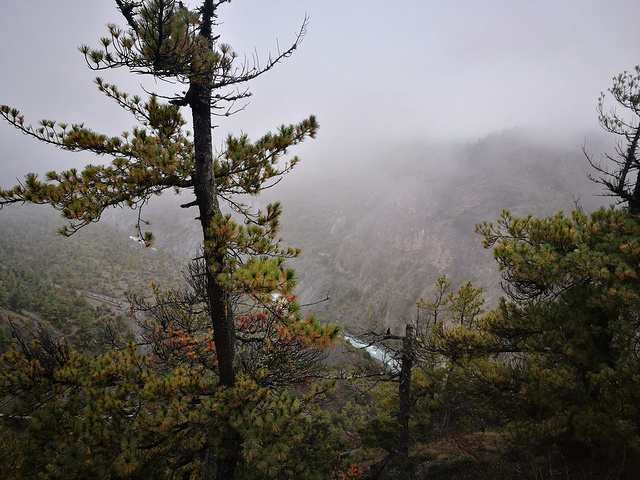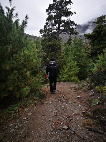 这一路都是在山腰小路上前进,时而会钻进小小的树林,可以明显看出,在这么高海拔的地方,植被已经主要以针叶林为主了。