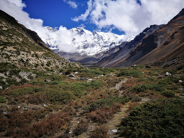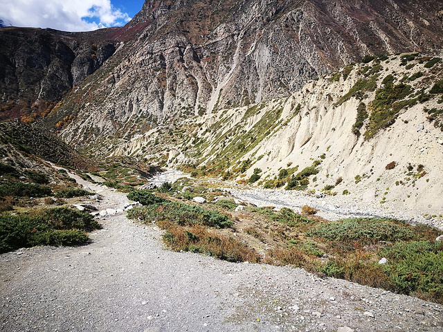 这一路向下会直接到达Yak Kharka,依然是沿着山脊的小路前进,起起伏伏,路上还遇到了御马而过的养马人(真的很羡慕他们可以骑马啊)。