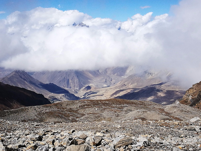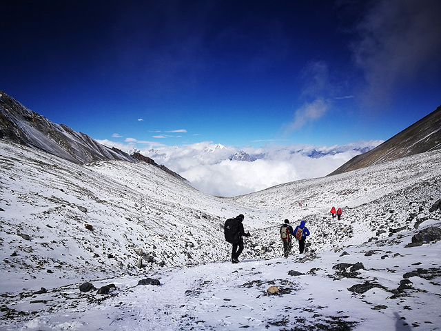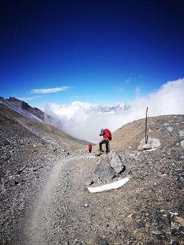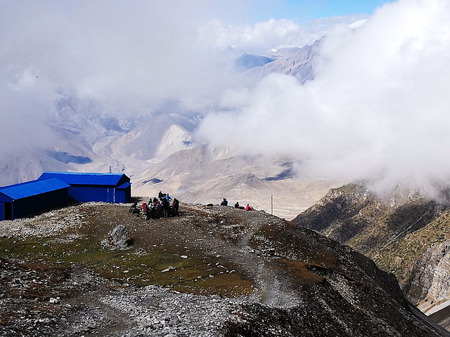 我们到达垭口的时间是上午9点,在9点半的时候已经隐隐刮起了大风。于是我们赶紧收拾行装,开始下山。据咸鱼三人组的背夫说11点开始一定要下山,会刮大风,比较危险,所以大家才都会凌晨就爬起来开始走。