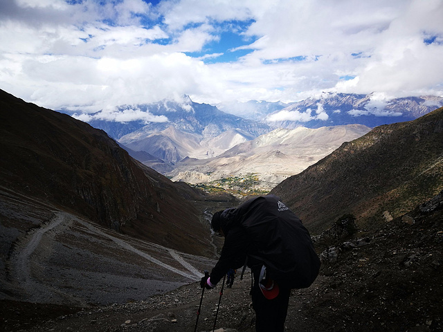 这一段下降大概有1000多米的海拔,然后我们终于是在正午左右看到了下一个村庄Chabarbu(上图绿色部分),我们在这里吃了最难吃的一顿Dal Bhat后继续下降,终于是在下午4点到了Muktinath,咸鱼大师已经在旅社等了我们4个小时了。
