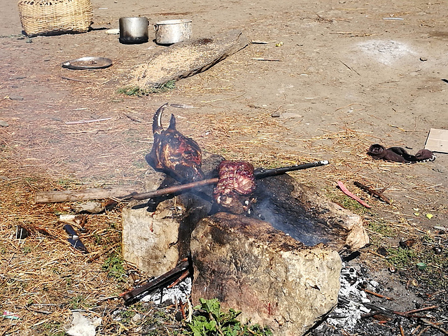 走不多久就遇到了独间的两间小石头房,一家人在这里生活,仔细一看居然还在烤肉(貌似是牛)吃,看上去就想咬一口