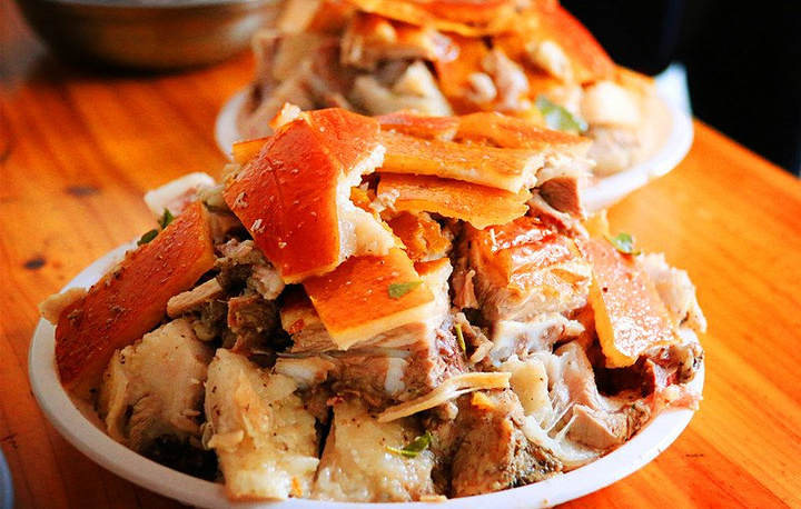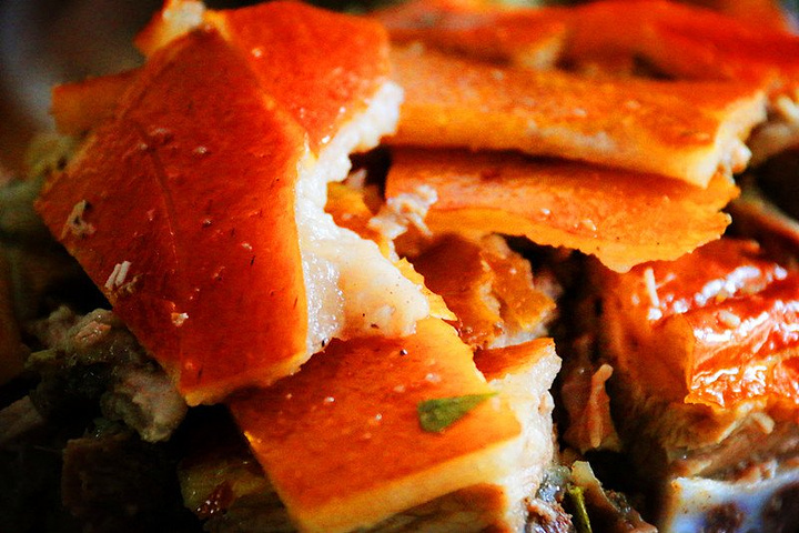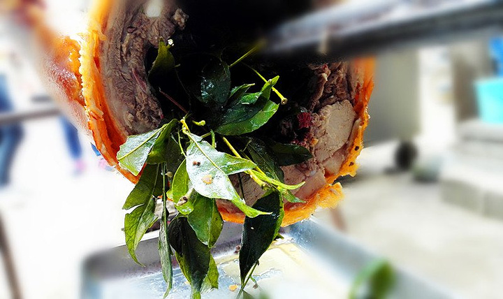 烤好的猪皮“色同琥珀,又类真金,入口则消”,猪肉“状若凌雪,含浆膏润,特异凡常”,清香可口,肥而不腻,带着鸡皮果树叶特有的浓郁香气。