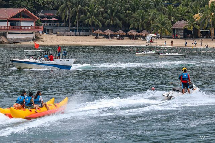 海上玩乐一日游,冲浪🏄、香蕉船、海上快艇🚤、潜水、烧烤等应有尽有,玩到嗨、爽到爆冲浪的海滩翻滚的香蕉船让我们体验掉进海水的感觉,不过有我你别怕烧烤后看看海景吹吹海风美人鱼本人专利,请勿模仿今天皮肤晒伤了来自游记婚旅三亚