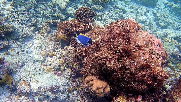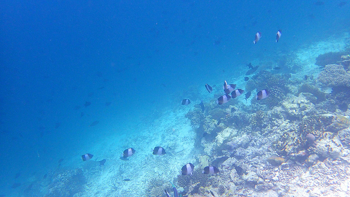 船屋驶离小岛半小时后,在茫茫的印度洋上,船长示意可以下水了。深海浮潜是由一名浮潜教练带着一组下海,跟我们一起下海的小黑是个很腼腆的小伙子,笑起来非常好看。 整个浮潜的过程应该说比较辛苦,深海的水流很急,游起来会更加费力,呼吸也需要更加用力。教练在一侧,杰哥在一侧,对我来说,只需要调整好呼吸,基本都是由他俩拉着向前的。 深海浮潜真的需要脚蹼,否则真心累,40分钟已经感觉精疲力尽了,再过两分钟我已经有点晕晕的感觉了,就像晕车一样的感觉,于是立马示意回船上,船一直跟在我们附近,很快我们就到了船上,但我依旧有些难受。 应该是太累了,又有些坐船吧!后来同行的小夫妻给了他们组的小黑五美元,这才意识到我们没想到这件事,也没有带钱过来,不过觉得憨厚的小黑非常棒,所以找小伙伴借了钱,也给到了我们的小黑 不过后来和另一艘船上的人聊到这个,发现他们都没有给,浮潜小费这东西就看个人啦,应该不是像餐厅一样必须给的。