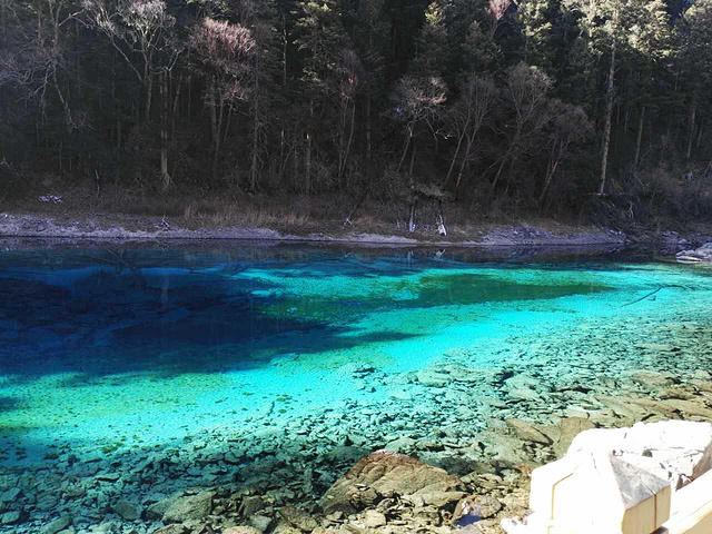 推荐美景,五彩池。白色的冰雪散落在池边,金色的阳光照射在蓝绿色水面上。