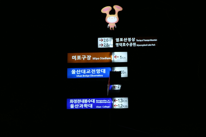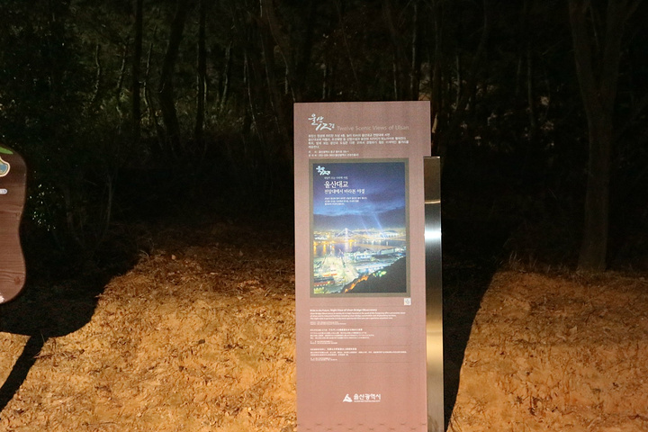 往蔚山展望台走的路上,就远远的看到了亮着灯的蔚山展望台高高的耸立在黑暗当中!黑暗这还有指示牌。。。