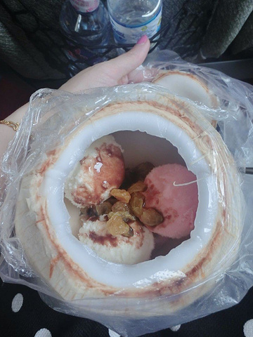 甜品端上桌,原来是椰香冰淇淋,椰子掏空装上冰淇淋,太美味