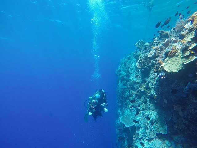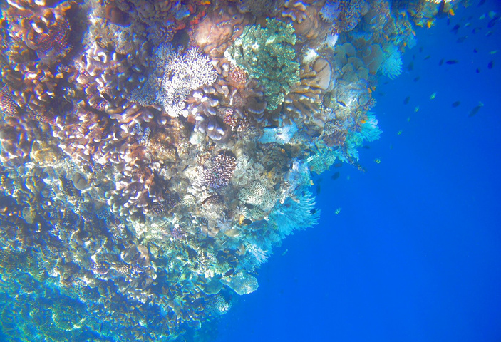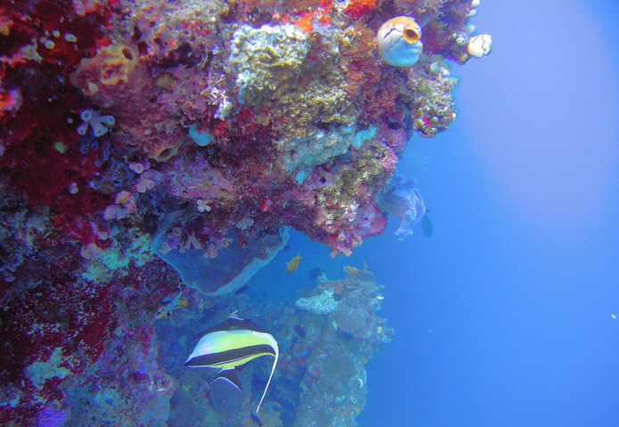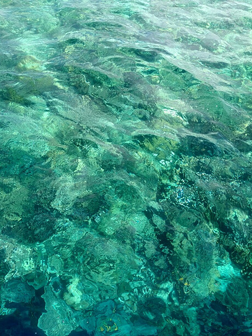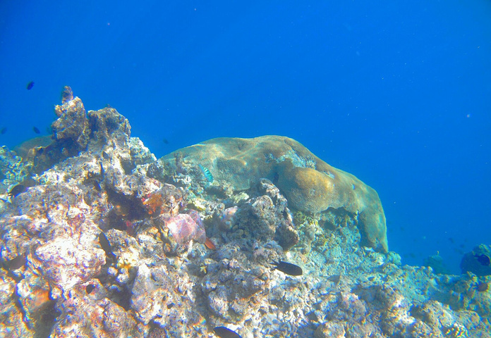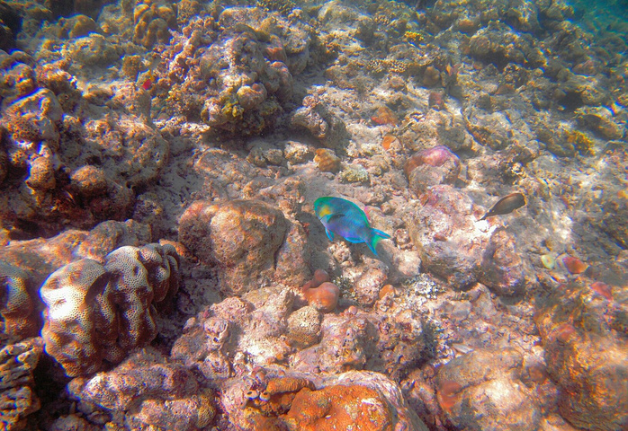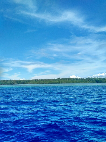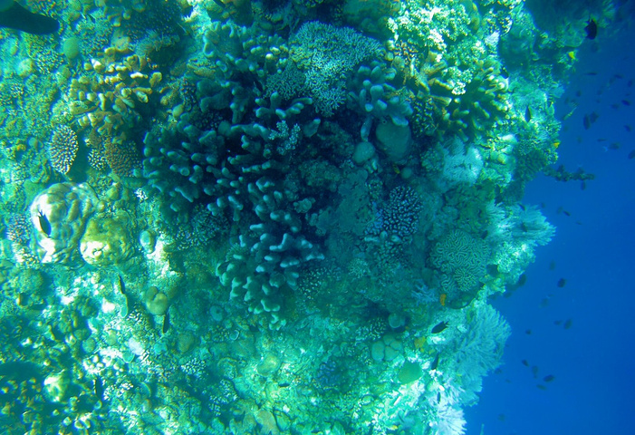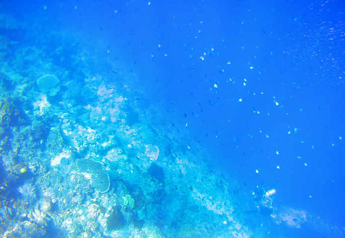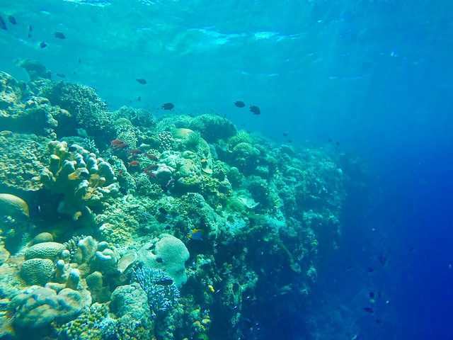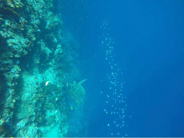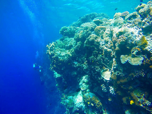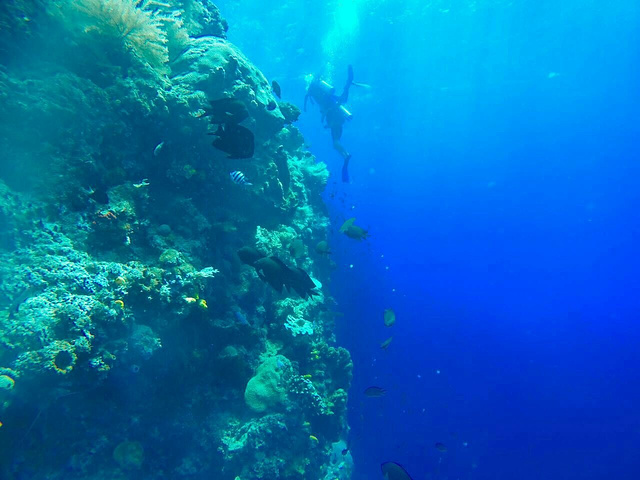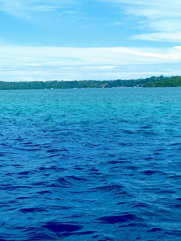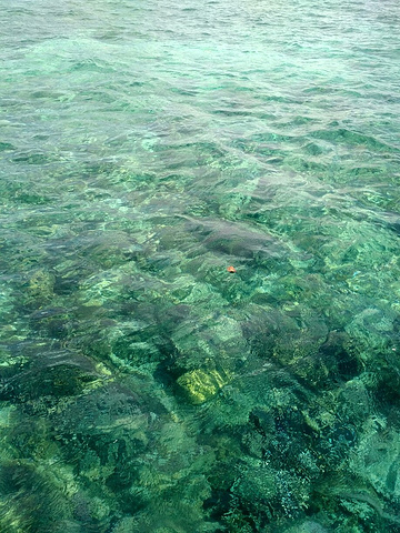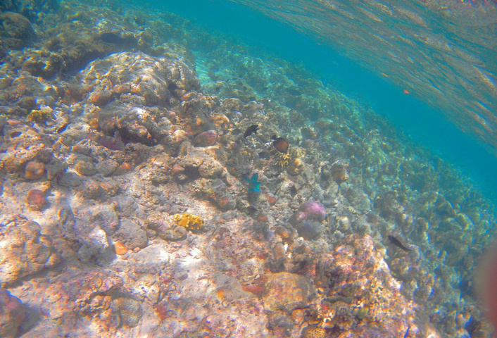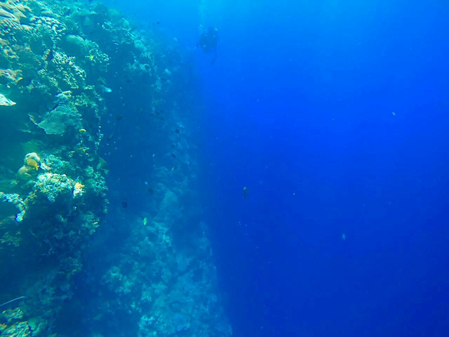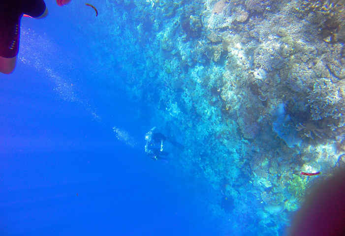 远处的海水两种颜色泾渭分明,一边绿色,一边深蓝。到了近处,我们才明白绿色海水下面全是珊瑚适合浮潜;而深蓝色海水下是陡峭的海下悬崖,是深潜的绝佳位置。