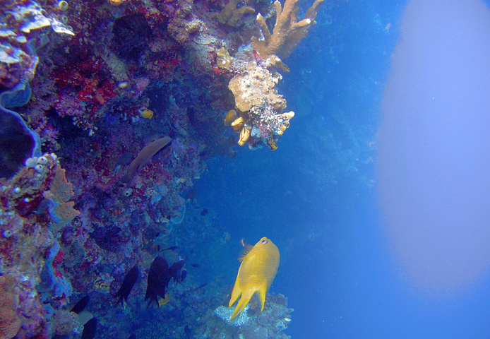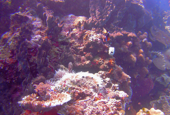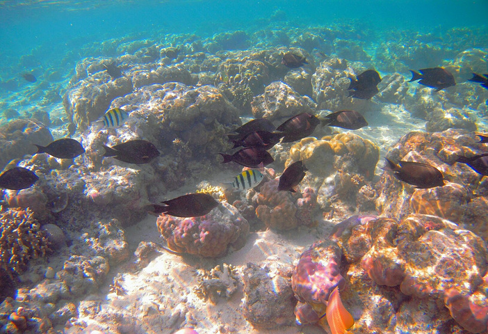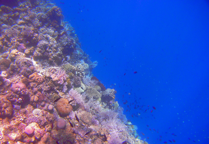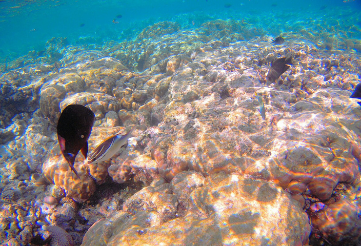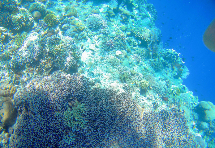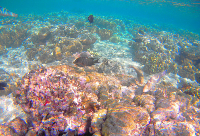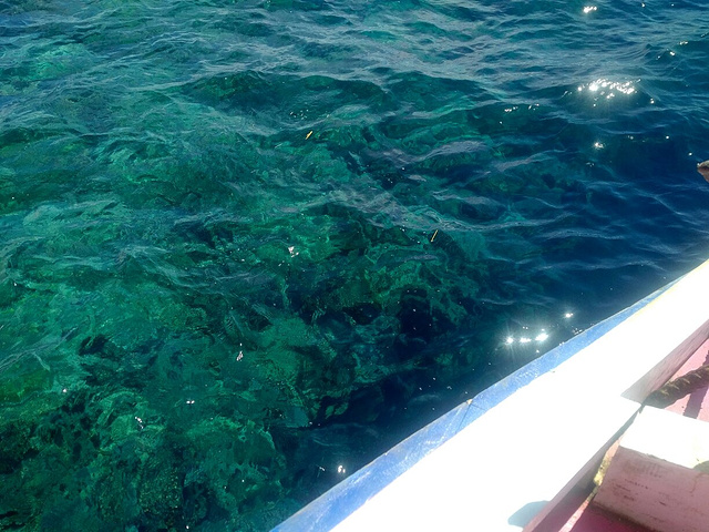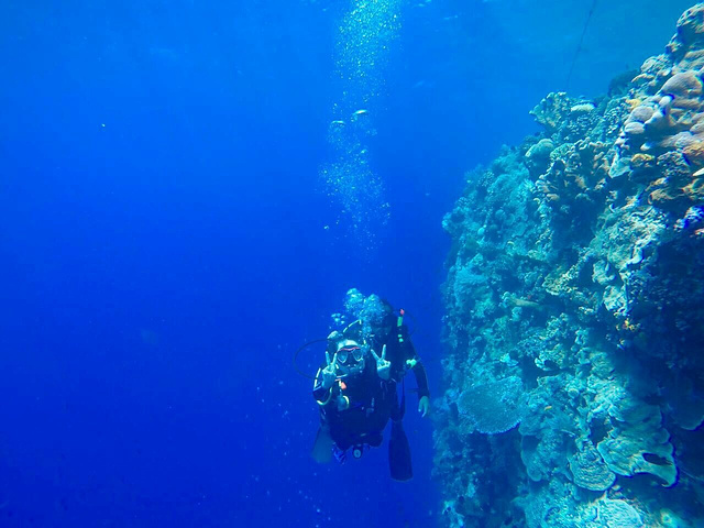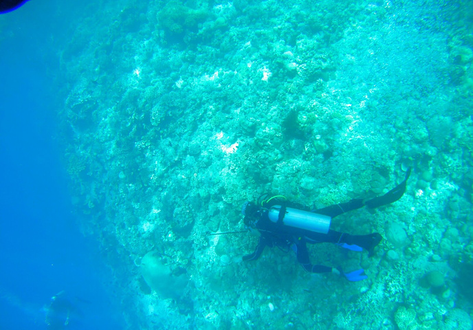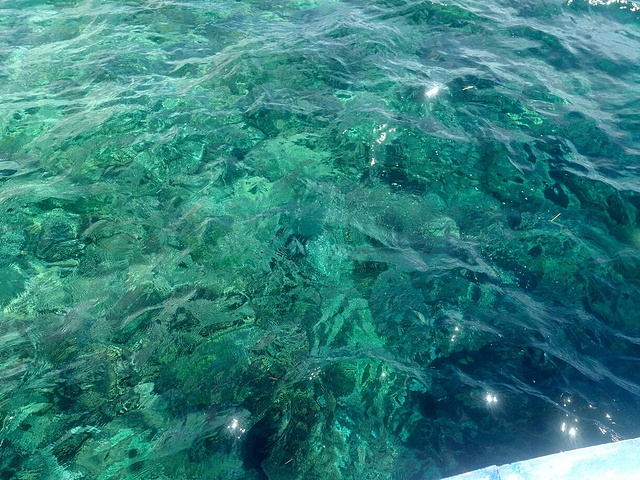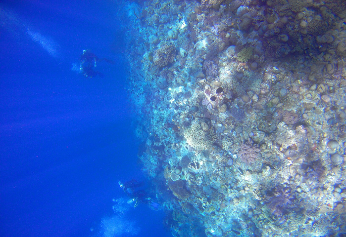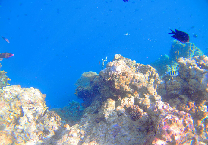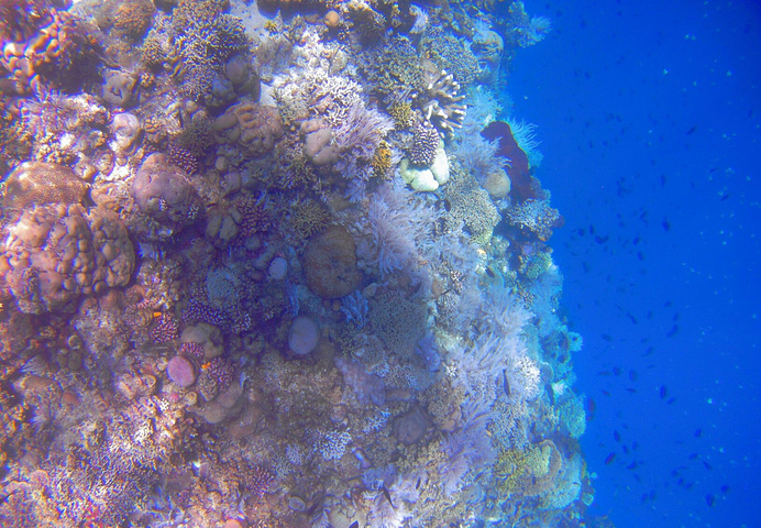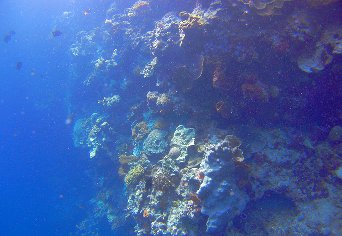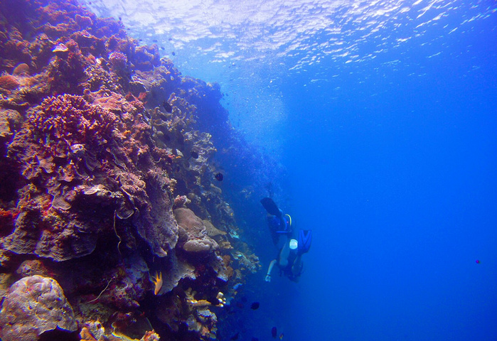 远处的海水两种颜色泾渭分明,一边绿色,一边深蓝。到了近处,我们才明白绿色海水下面全是珊瑚适合浮潜;而深蓝色海水下是陡峭的海下悬崖,是深潜的绝佳位置。