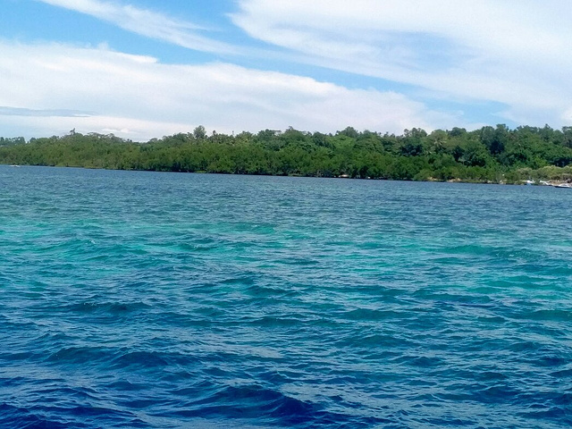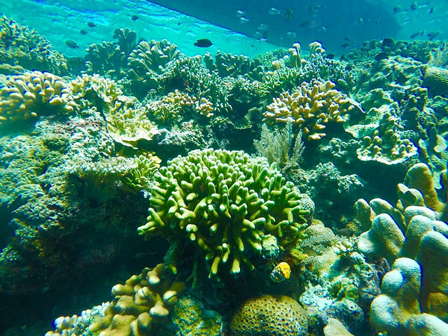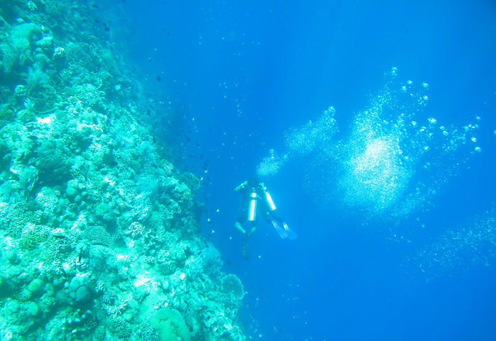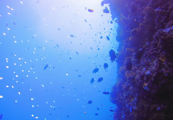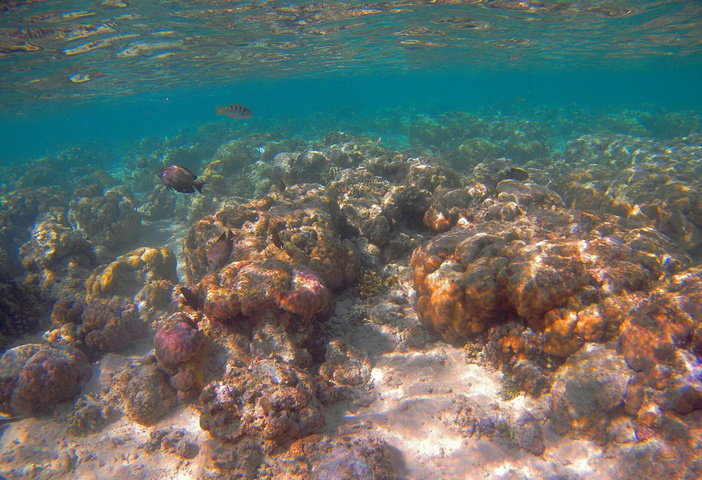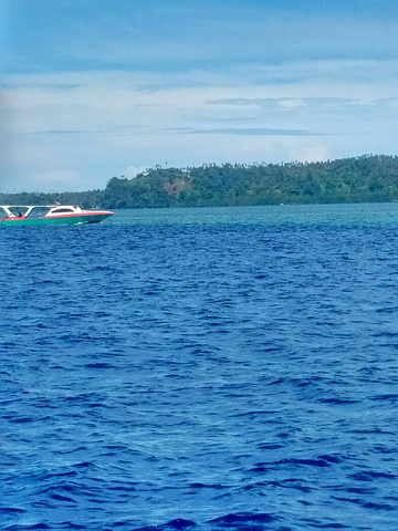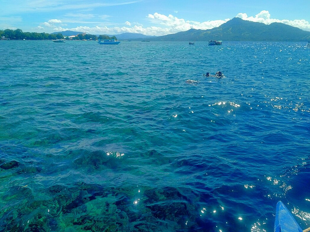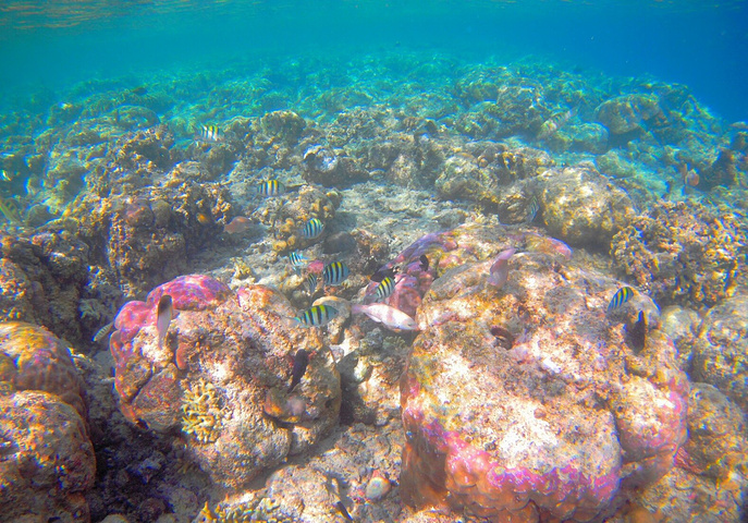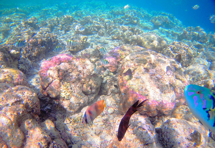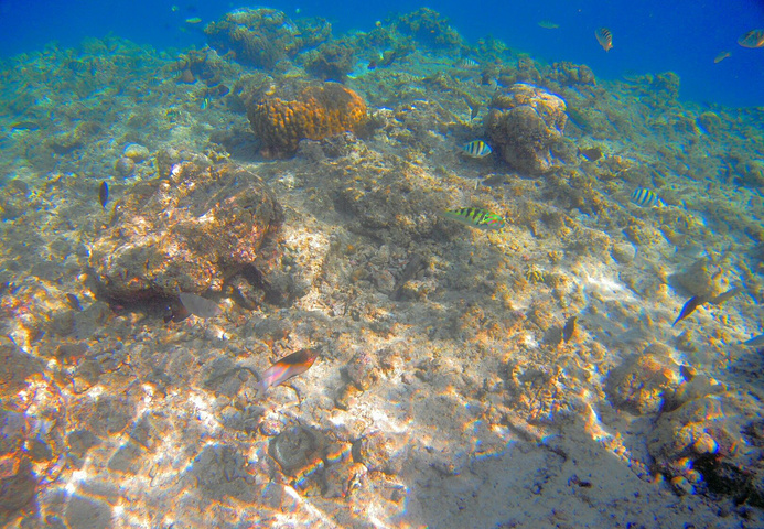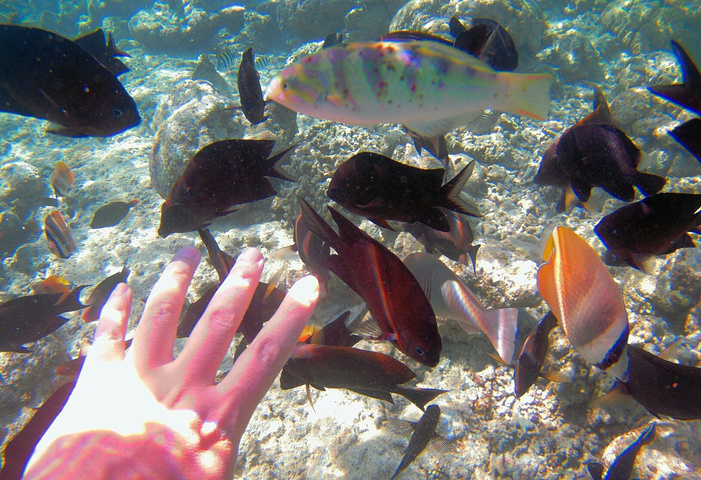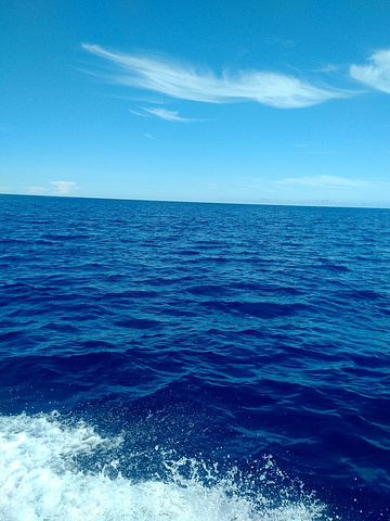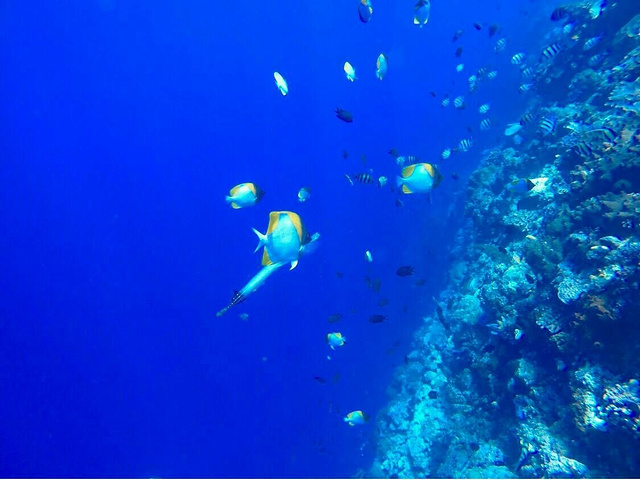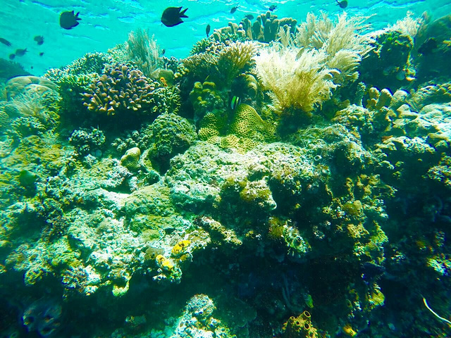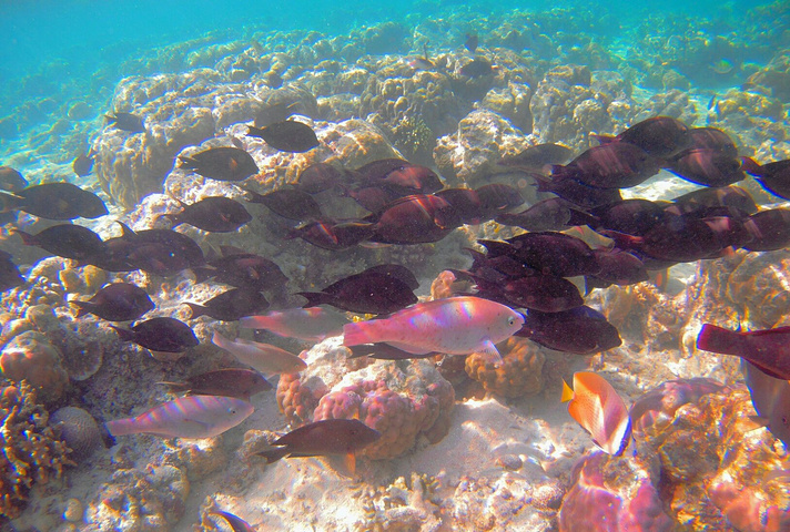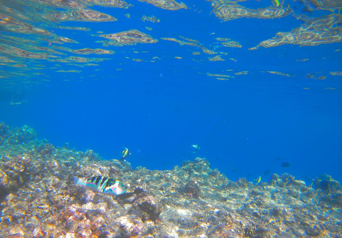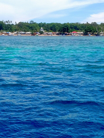 远处的海水两种颜色泾渭分明,一边绿色,一边深蓝。到了近处,我们才明白绿色海水下面全是珊瑚适合浮潜;而深蓝色海水下是陡峭的海下悬崖,是深潜的绝佳位置。