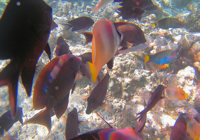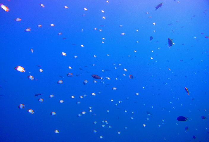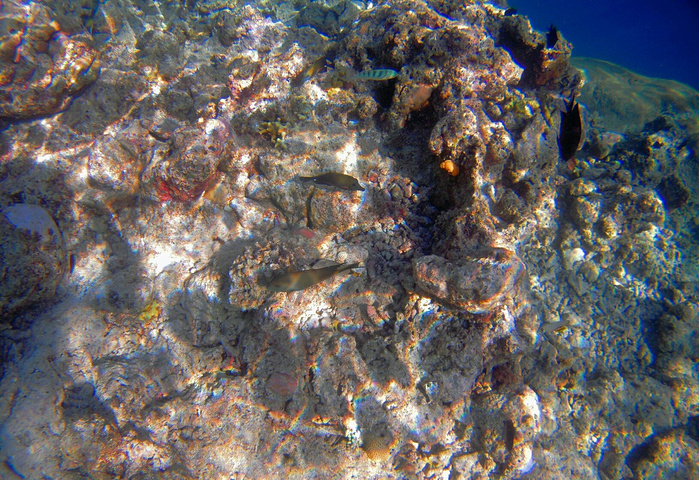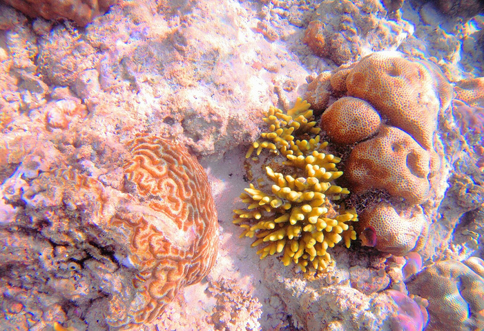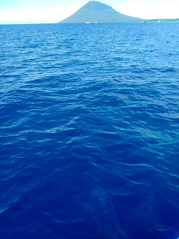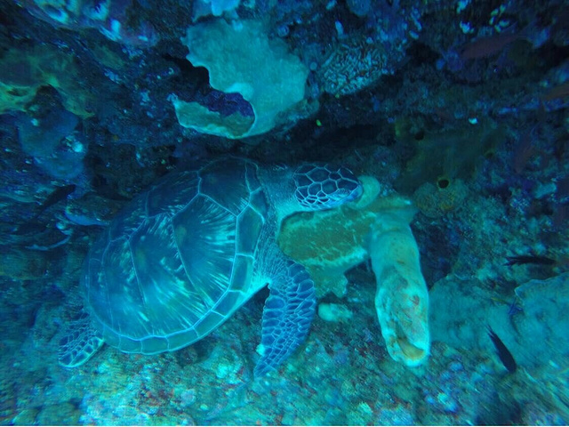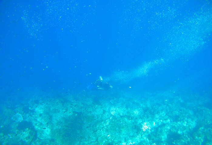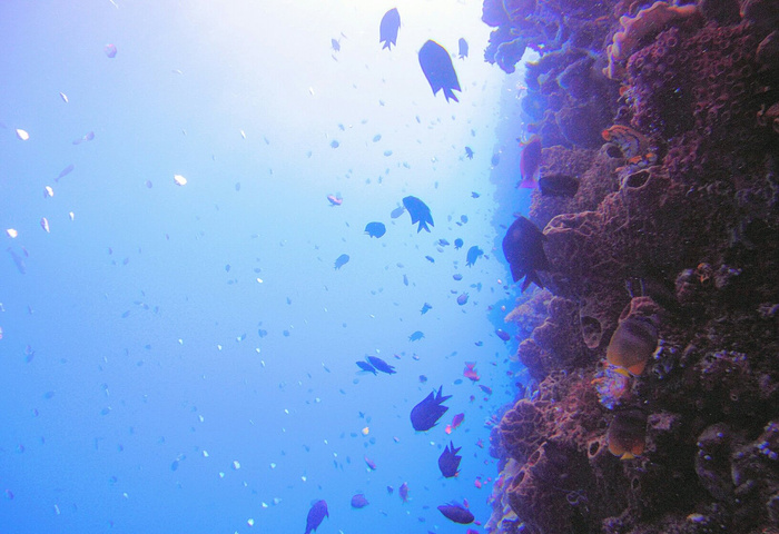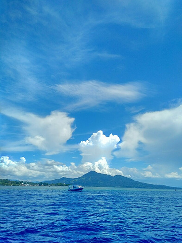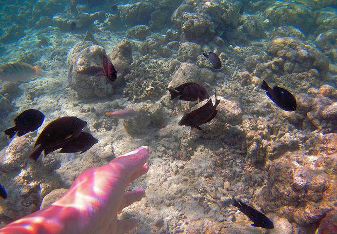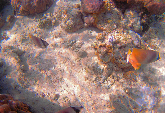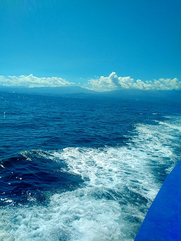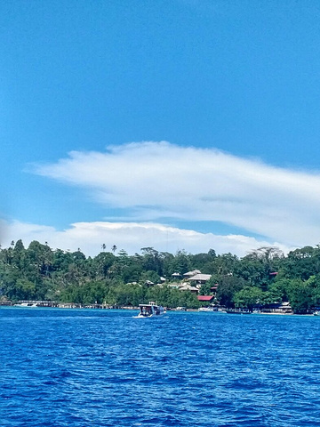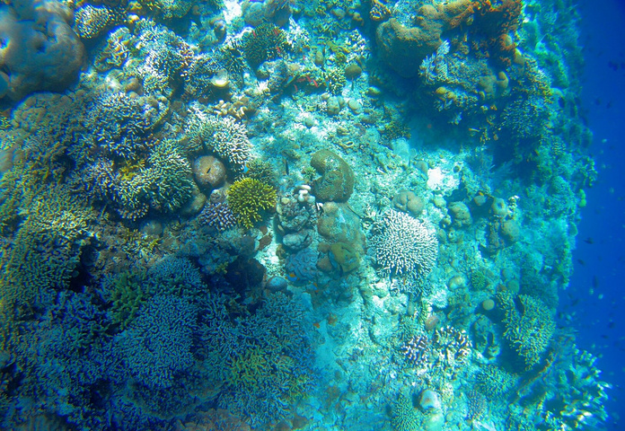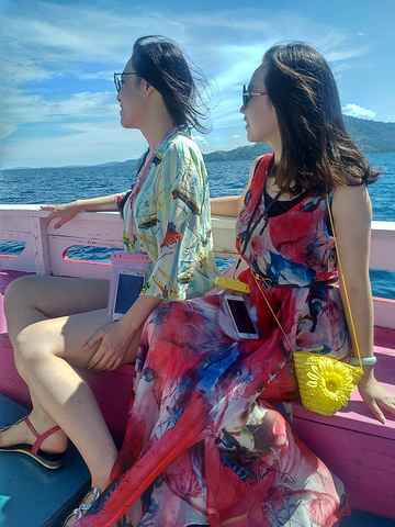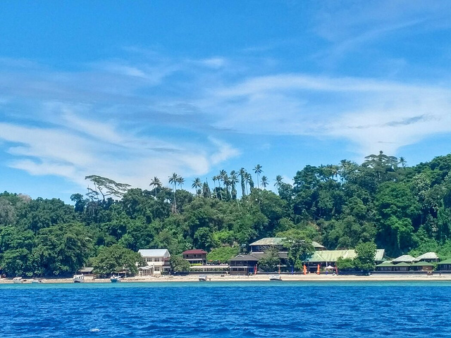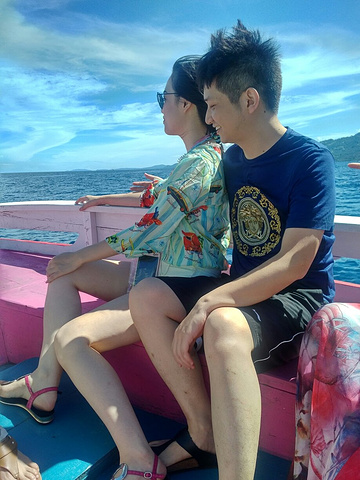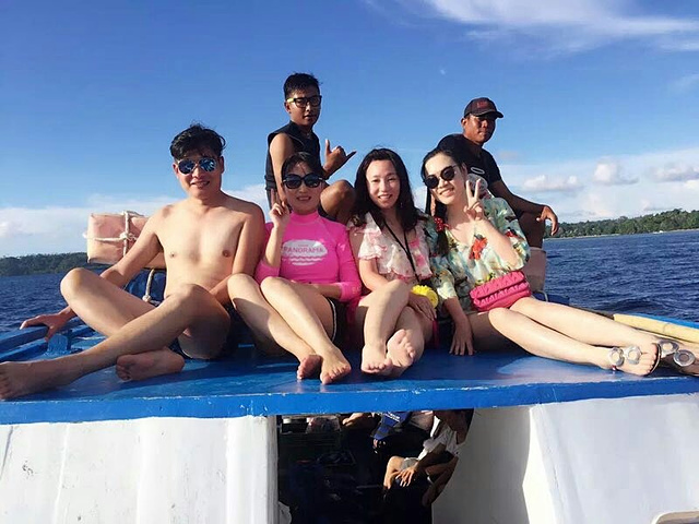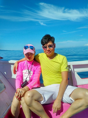 远处的海水两种颜色泾渭分明,一边绿色,一边深蓝。到了近处,我们才明白绿色海水下面全是珊瑚适合浮潜;而深蓝色海水下是陡峭的海下悬崖,是深潜的绝佳位置。