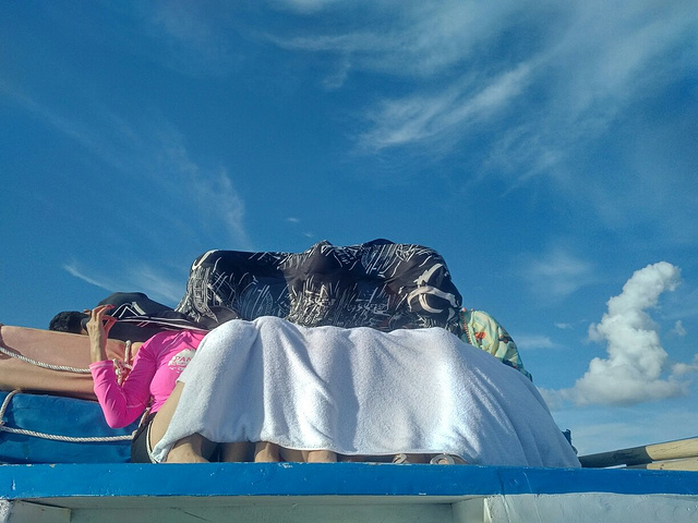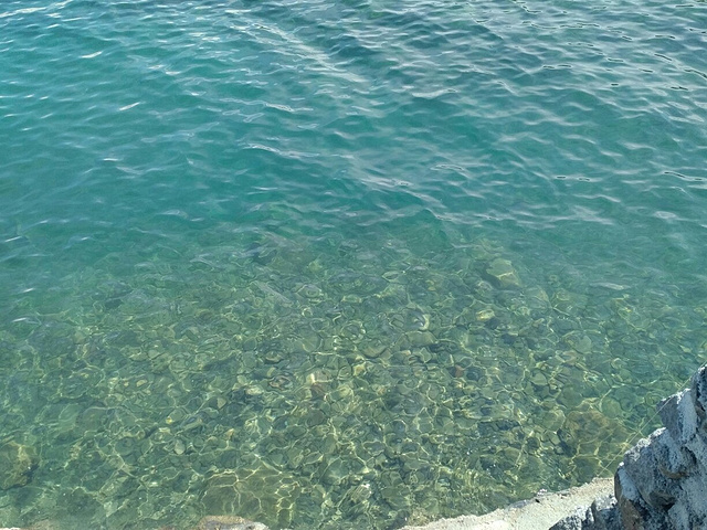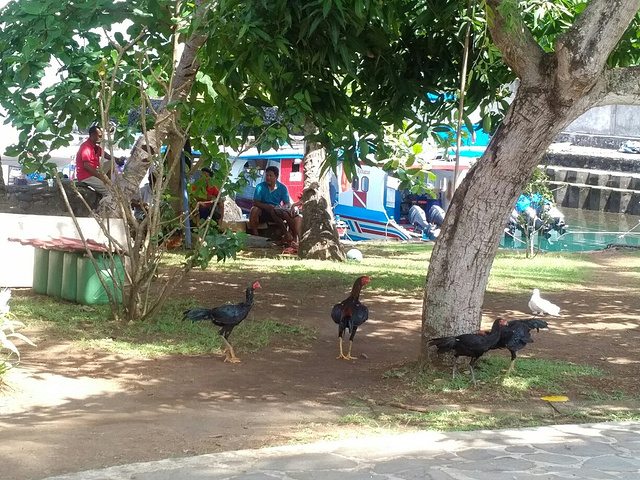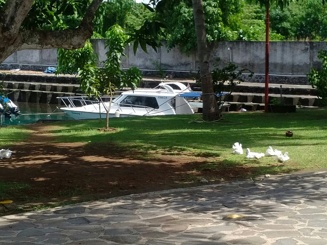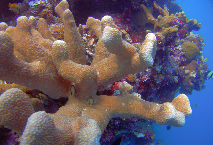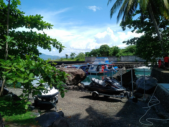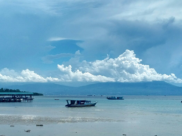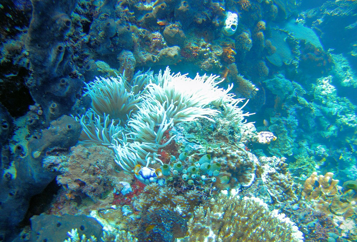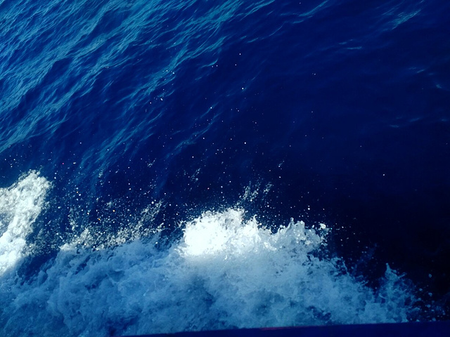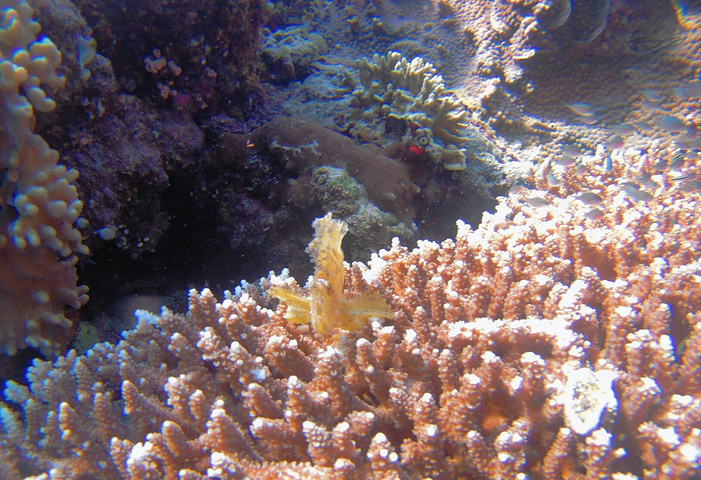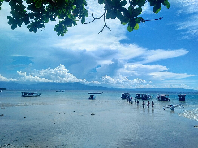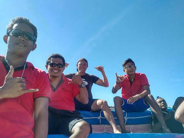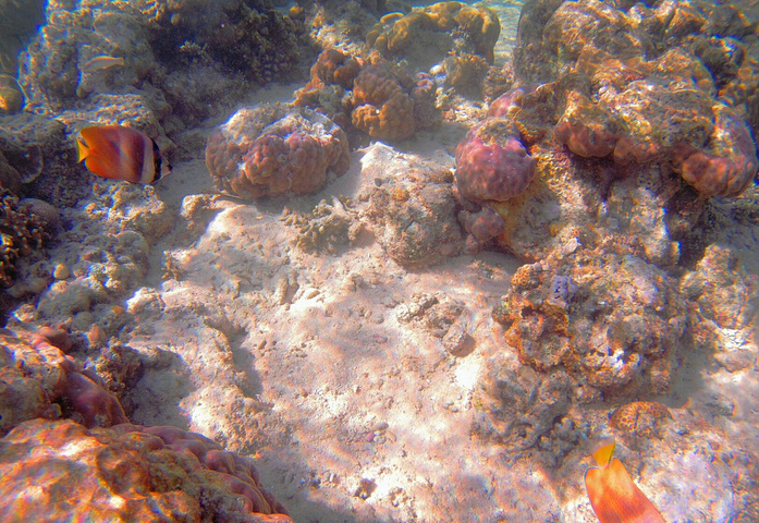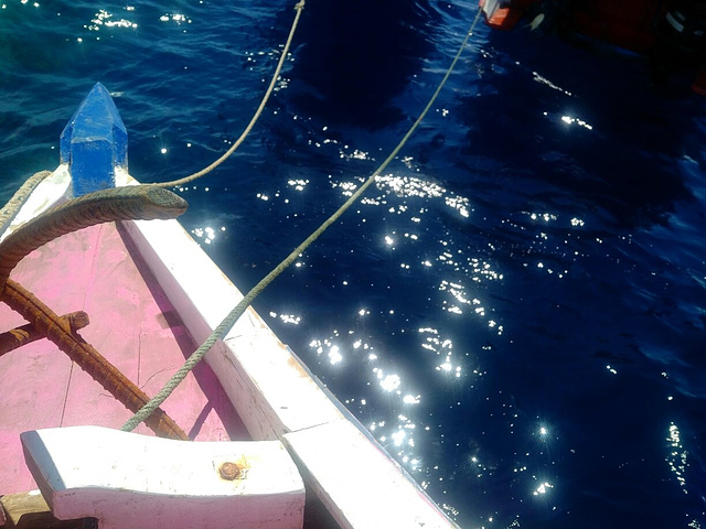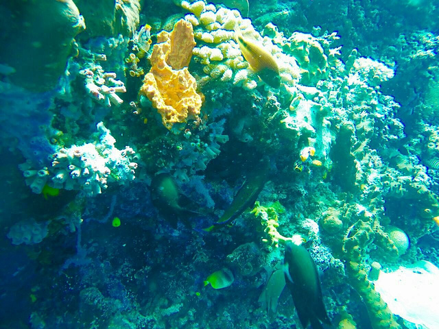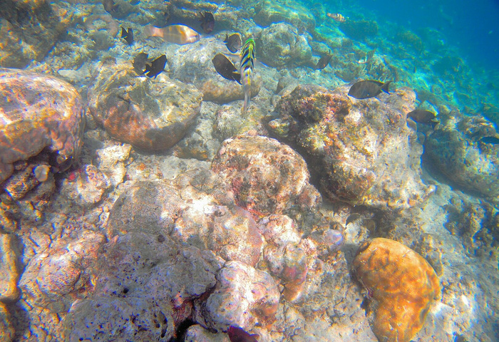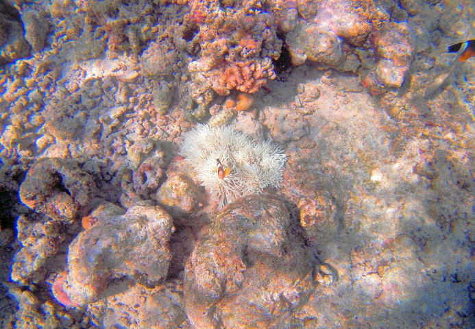 远处的海水两种颜色泾渭分明,一边绿色,一边深蓝。到了近处,我们才明白绿色海水下面全是珊瑚适合浮潜;而深蓝色海水下是陡峭的海下悬崖,是深潜的绝佳位置。