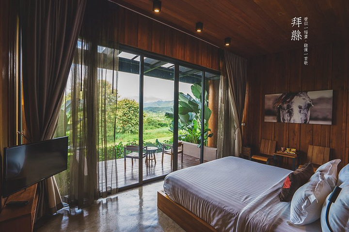 床尾侧是个大大的全景落地窗,外边就是一片田野,像个个世外桃源,温柔而静谧。落地窗外是个小露台,晚上坐在外面仰望星空,看着数不完的星星点点。