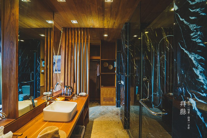 洗漱区域,大理石墙面和东南亚柚木的结合,简洁清爽。