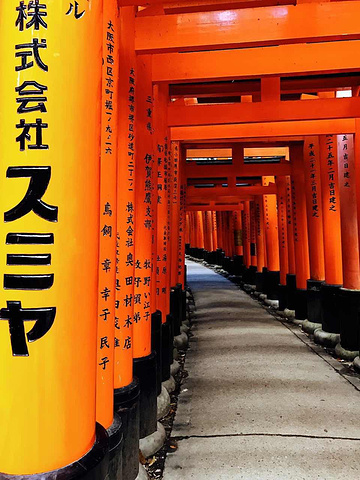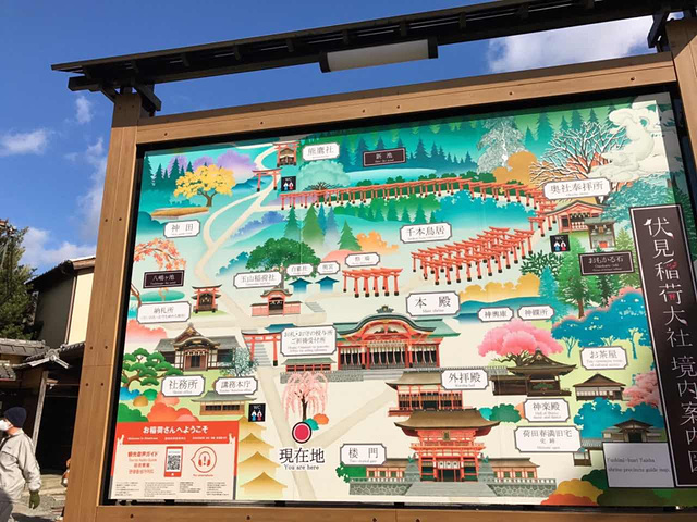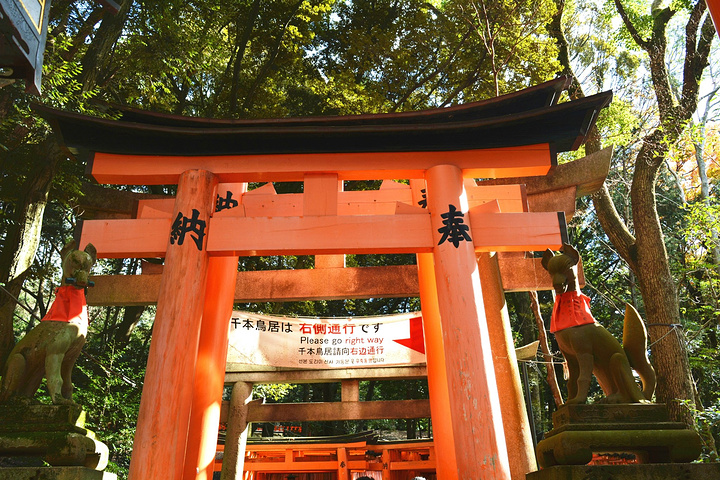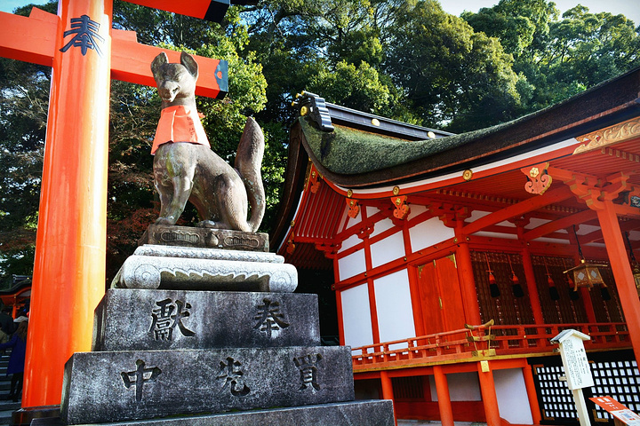 伏见稻荷大社的入口,矗立着由丰臣秀吉于1589年捐赠的大鸟居,后面便是神社的主殿及其他建筑物。在神社里,还能见到各式各样的狐狸石像,这是因为狐狸被视为神明稻荷的使者。狐狸脸形的绘马是这里的一个特色。