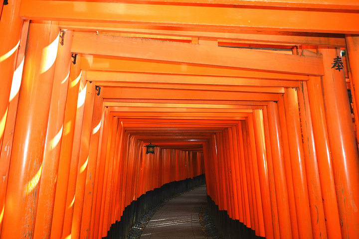 走进千本鸟居,老朽褪色的暗红色牌坊和光鲜亮丽的朱红色牌坊密集地交织在一起,透过阳光的照射显得格外壮观迷人,视觉上颇为震撼。