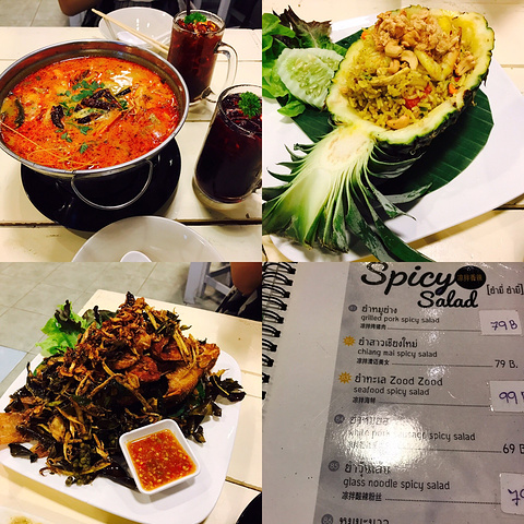 菠萝饭、炸鱼、冬阴功汤都很好吃,价钱也很便宜,当然清迈整体就是消费超低,因为这个也爱死清迈了。这家的店员都不会说中文也不会说英语,不过也不影响沟通,来吃的外国人超级多的。
