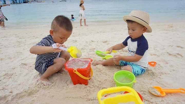 因为有点发烧,一路都要妈妈抱,把他们两口子累惨了,幸好最后小孩们看到了海沙,最喜欢的还是玩沙,其实一