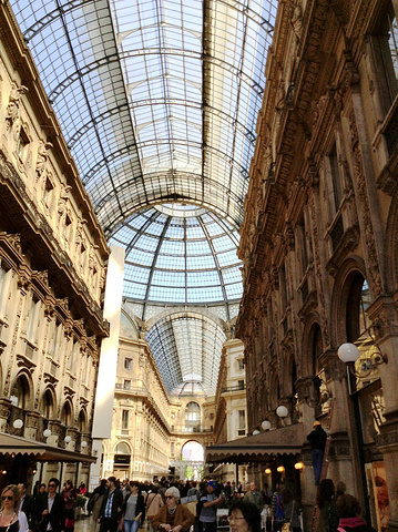 广场旁边,教堂右侧,就是艾曼纽二世回廊。回廊建于1865年,以意大利统一后的首任国王维多里奥·艾曼纽二世命名,开幕以来一直是米兰最受欢迎的购物广场。广场本身楼面呈拉丁十字形,顶端出口至斯卡拉歌剧院,下端出口至米兰大教堂,八角型的中心有描绘地球四大洲(欧、美、非、亚)和其它展现艺术、农业、科学和工业的镶嵌画。值得一提的是,广场的屋顶是意大利第一座以金属与彩色玻璃作为结构用途的屋顶,而非只是装饰,整个屋顶十分精致又气派非凡。广场的地面则是用大理石铺成的马赛克图案,以十二星座镶嵌画装饰。回廊巨大的拱形建筑富丽堂皇,长廊内装潢考究的店铺让人眼花缭乱。据说几乎想得到的名牌在这里都找得到。这座华丽的购物广场又被称为“米兰的客厅”,可见它在米兰人心中的地位有多么重要。因为下午还要赶路,我们没有时间进任何店铺了,导游只让我们随便走几步、拍拍照,很快便集合离去。