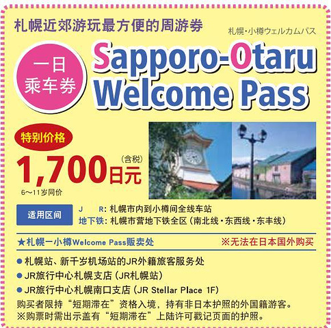 除此之外,札幌-小樽间的Welcome pass也是很推荐同学们购买的。说是可以一日内无限次来回札幌-小樽,但谁会一天跑来跑去好几次呢?所以说比直接买票也就便宜了200日元,但是这个pass还送札幌地铁一日券,放着札幌景点走一遍还是有些用处的。