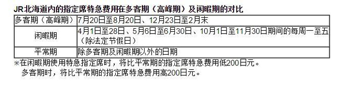 去过日本的同学,应该都知日本的火车除了火车票钱,还要加指定席和自由席的钱。而北海道JR的指定席费用会根据高峰期、平常期、闲暇期上下浮动200日元。以10月29日(闲暇期)札幌去洞爷为例,票价是3240日元、自由席是2160日元、指定席是2480日元,也就是说平常期、高峰期指定席的价格分别为2680日元、2880日元;(札幌去小樽全部都是指定席,票价640日元,指定席价格不变,一年都是310日元)