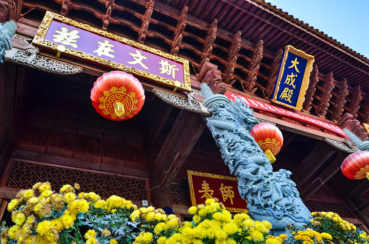 文庙大门向东,门旁立一块“文武官员到此下马”石碑。文庙中轴线为南北向,自南为照壁,前为泮池,上有石拱桥,池四周以石围栏,前为一高两低三跨式石牌坊,曰棂星门,石坊左侧有门曰礼门,右侧曰义路,坊后右侧为名宦祠、兴贤祠,左为乡贤祠、承祭祠,中为甬道至大成门,门上挂一大匾书“大成”二字,院中四角植柏树,大成门后中为甬道,两侧为东西两厢,院以方砖铺砌,四角植柏树,甬道直达大成殿拜台,俗称天子台,台高约1米,三周环以汉白玉石栏,后为大成殿,殿为单檐歇山顶,面阔七间,进深15.6米,高11米,规模宏伟,庄严大方,内供孔子牌位,中间两棵立柱上雕刻两条盘龙。