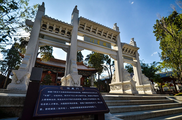 “棂星门”是文庙中轴线上的牌楼式木质或石质建筑。“棂星”即灵星,又名天田星。《后汉书》记载,汉高祖祭天祈年,命祀天田星。天田星是二十八宿之一“龙宿”的左角,因为角是天门,门形为窗棂,故而称门为棂星门。皇帝祭天时,要先祭棂星。袁枚在《随园随笔》中说:“后人以汉灵星祈年与孔庙无涉,又见门形为窗灵,遂改为棂。”在宋代,棂星门又称“乌头门”,文庙修棂星门,象征祭孔如同尊天。文庙中的棂星门是在明太祖洪武十五年以后出现的,象征祭孔如同尊天。后来人们又将棂星解释为天镇星、文曲星、魁星。古人认为“天镇星主得士之庆,其精下为灵星之神”,以棂星命名孔庙大门,象征着孔子可与天上施行教化、广育英才的天镇星相比,又意味着天下文人学士汇集于此,统一于儒学的门下。
