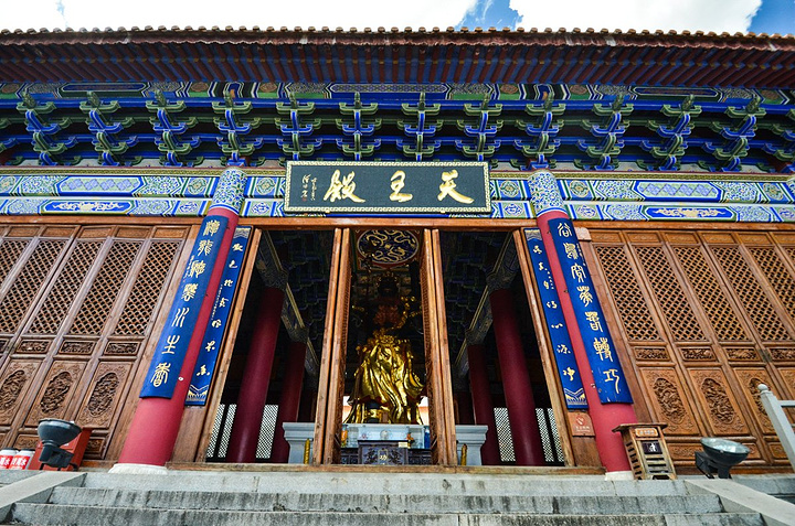 天王殿,又称弥勒殿,是佛教寺院内的第一重殿,殿内正中供奉着弥勒塑像,左右供奉着四大天王塑像,背面供奉韦驮天尊塑像,因此而得名。