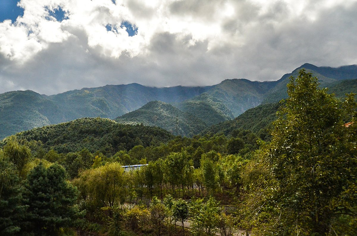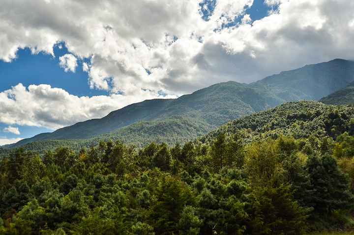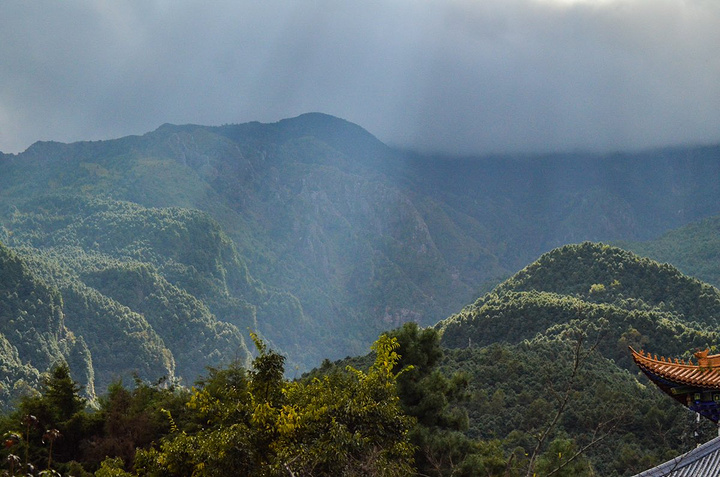 乌云里散落的阳光就像佛光普照一样洒在这苍山之上。