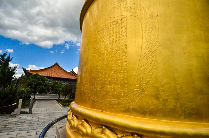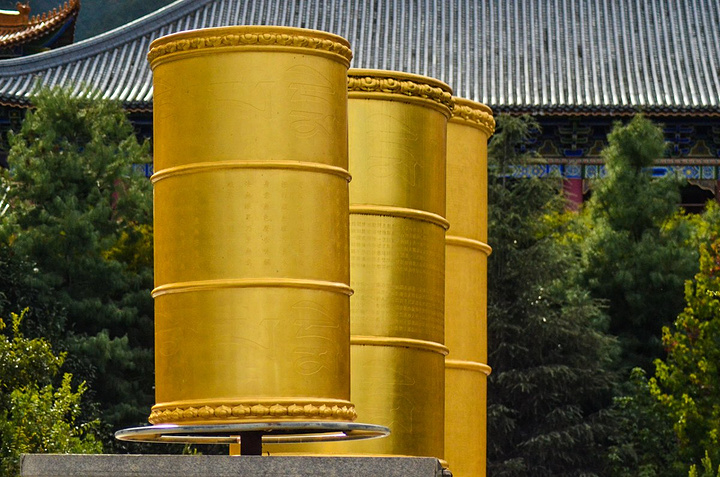 在这里的转经筒体现了藏传佛教的思想,经筒上刻有经文。