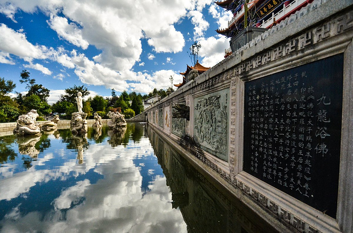 阿嵯耶观音阁前的九龙浴太子喷泉以九龙浴太子传说为题材,将九龙和太子以石雕形式雕刻成一组景观,并采用石雕和高科技喷泉结合,体现浴佛的真实效果。
