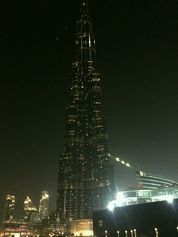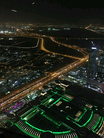 晚7点,我们一行九人参加此行的第五个自费项目----夜登哈里法塔观光。每人80美金。哈里法塔原称“迪拜塔”,世界上第一高楼。楼高828米,169层。耗资15亿美金。拥有世界上最高游泳池,最高清真寺,最多最快电梯。电梯56部,最快运行17.4米/秒。我们排队安检、乘高速电梯到124层,不到1分钟。俯瞰夜幕下的迪拜,只见灯火一片,流光溢彩,好一个火树银花不夜城。真美!