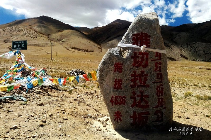 我们好像出现了高反,人显得疲惫,提不起精神,很想吸点氧气提提神,可是在仲巴买的那罐一次性氧气早在两天前去普兰的路上就用掉了,后悔没有多买几罐。在阿里高原,不论你是否有高反吸些氧气都是有好处的,之前我也不信,甚至怀疑那罐里装压根儿就是普通的空气,只有吸了才知道,的确会缓解不适症状,那怕只是小小的一口,现在没了,忍忍吧。直到看见路边一块雅切拉达板的石碑才算回过神来。