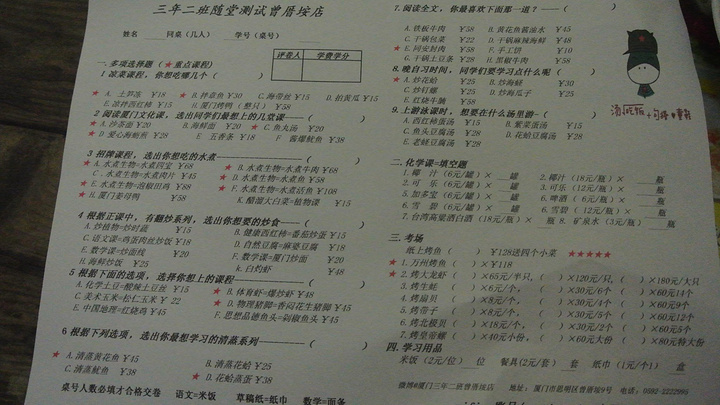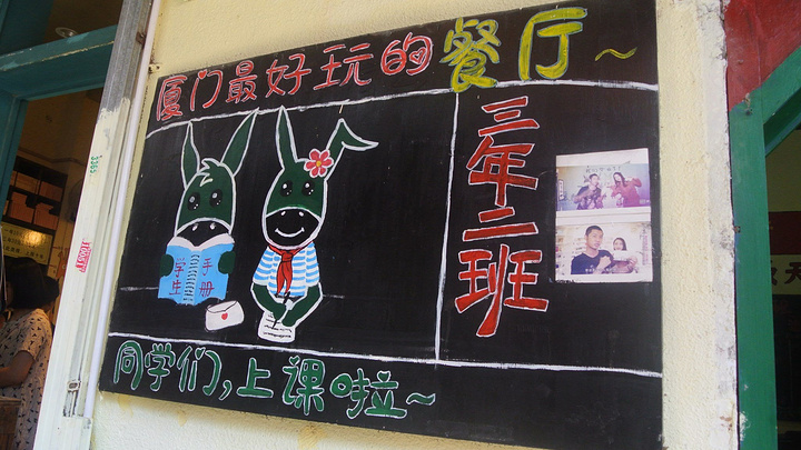 对于三年二班,我只能说噱头大过于实质性的东西~里面空间很小,很旧~菜单是试卷,点菜是交卷,劳动委员负责打饭打水,喊服务员是报告老师~一切的一切都像那么回事~我们团了200的代金卷,所以今天可以多点一点~于是点了一个大龙虾,还有一个由于还有个花蛤蒸蛋,等着大吃一顿~
