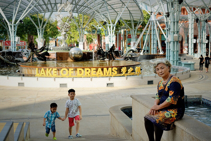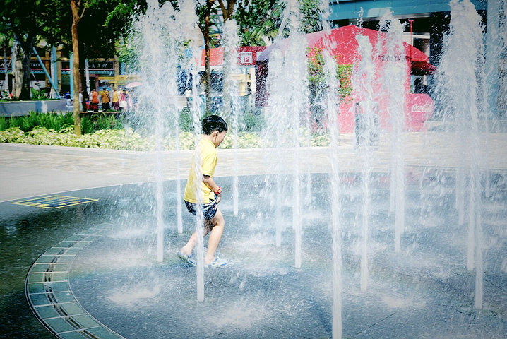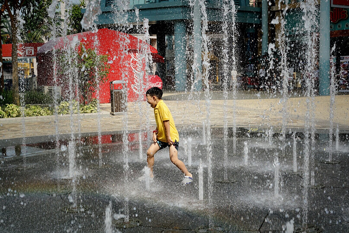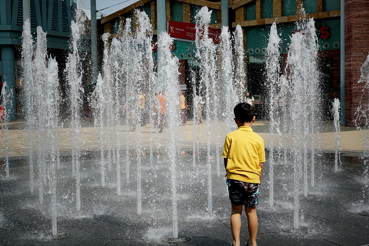 广场有个小喷泉,哥哥好喜欢在这里穿来穿去。弟弟看了很是羡慕,可又没有跟上去的胆量。