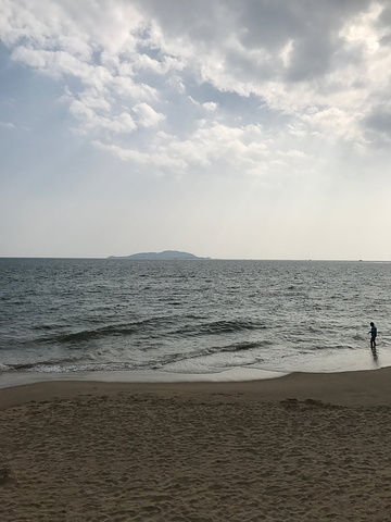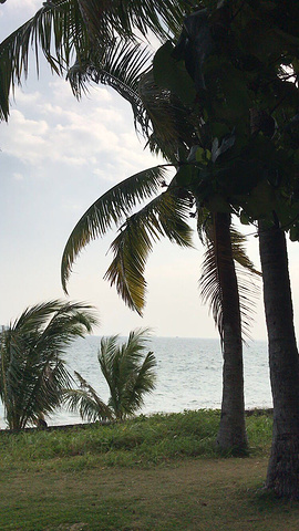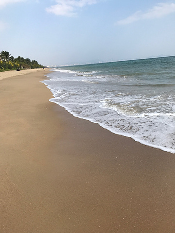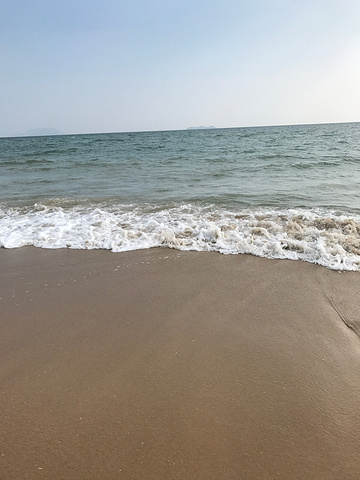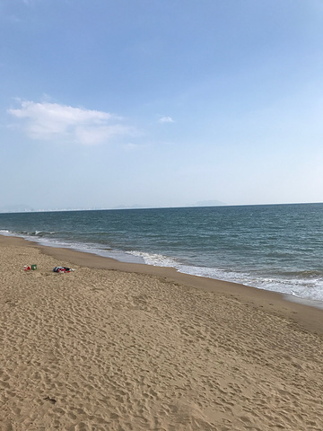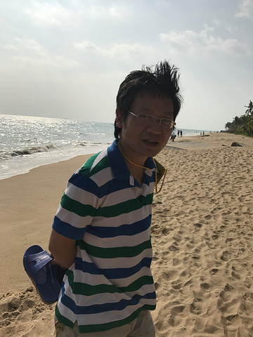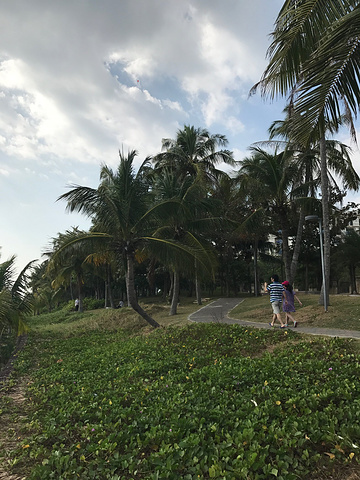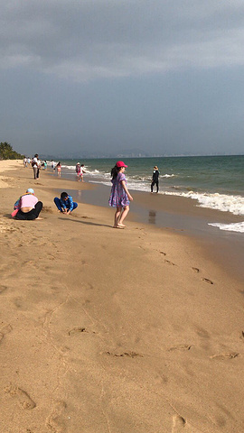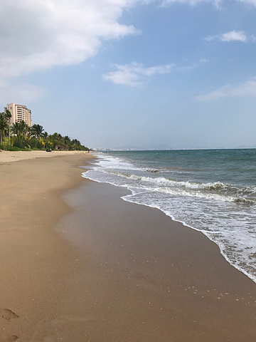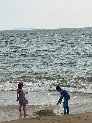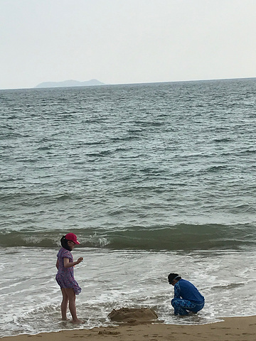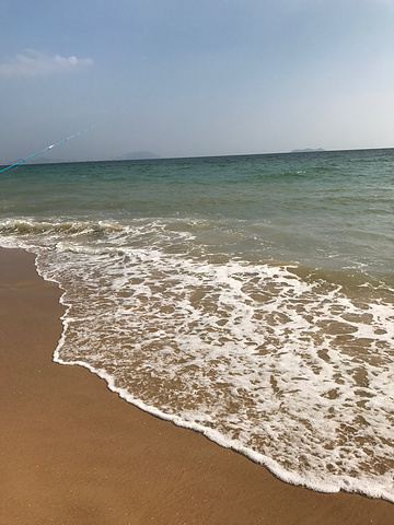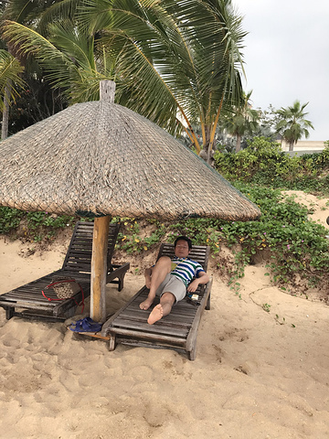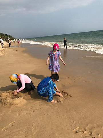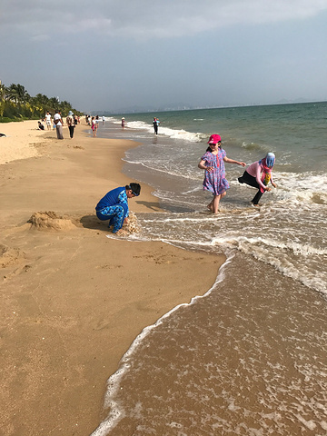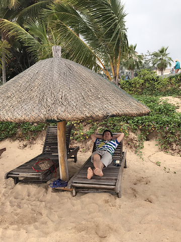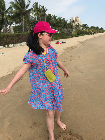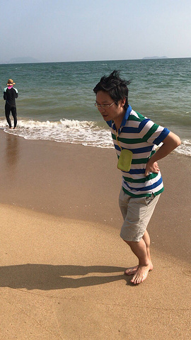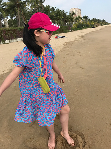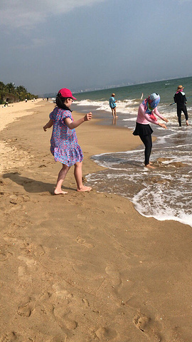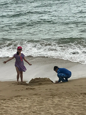 沿着海边往回开,突然发现一片风景秀丽的沙滩,有人在海钓,几个东北口音的人给我们看他们钓到的螃蟹,够炒一大盘的了,沙子看起来白的晃眼,海浪也好像要比天涯海角的大些,于是决定停下来耍会,桐直奔沙滩,又一次玩起了冲浪和沙子,我们沿着沙滩往前走,偶尔看到几个外国人悠闲的走在沙滩上,不远处居然有躺椅和亭子,而且是free,随便躺,感觉像又回到了黄金海岸一般!不过,老公说这些老外不应该来三亚,这里和外国没有啥区别,他们应该去北京或者其它有雾霾的地方感受一下,😄