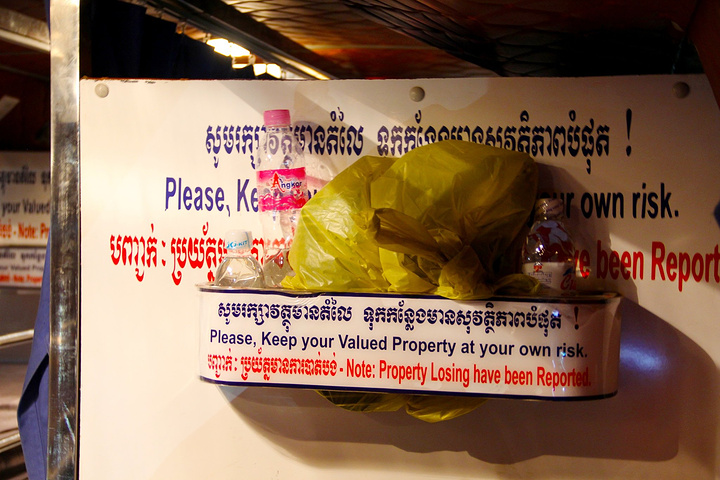 我们是提前两天从客栈那里订的(后来在老市场也问了,价格也是一样的),订的时候老板一再告诉你一定要早点订,不然没有位置。大巴车的工作人员会到客栈里来接你,所以你只需要收拾好东西安心等待就好了,我们大概六点钟就结束了外圈的行程,回来后去附近简单吃了饭,买了水,因为之前查看攻略的时候看到岛上物价较高,所以就傻不拉叽三个人提了两大瓶水上车了,谁知道车上还送水。我们从暹粒去的时候是分到了上铺,两个人一个铺位,可以坐起来无压力的那种高度,如果你是瘦子应该没关系的,就算不是瘦子也没办法因为铺位中间有一个小栏杆拦着,到了车上也发现下铺实在太拥挤,所以后来我们从西港回来的时候依然选择上铺。上铺是1B\2B这样的编号,下铺是1A/2A。