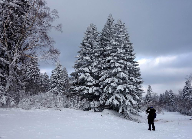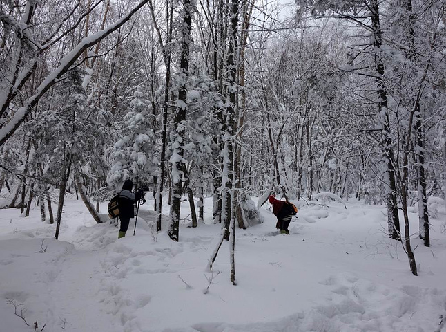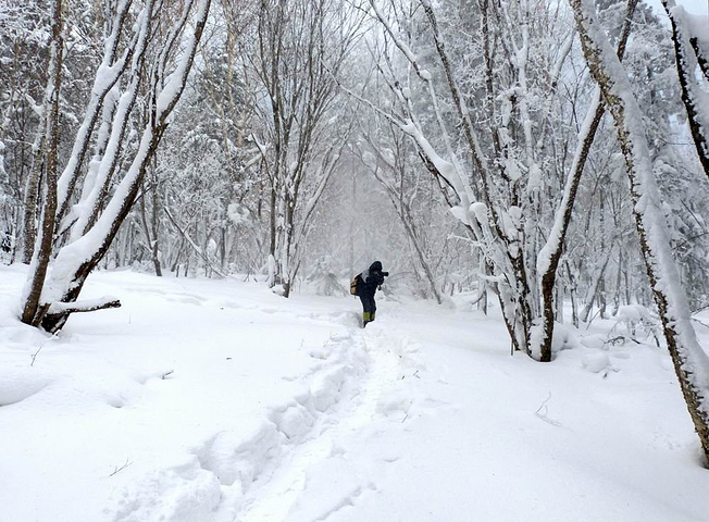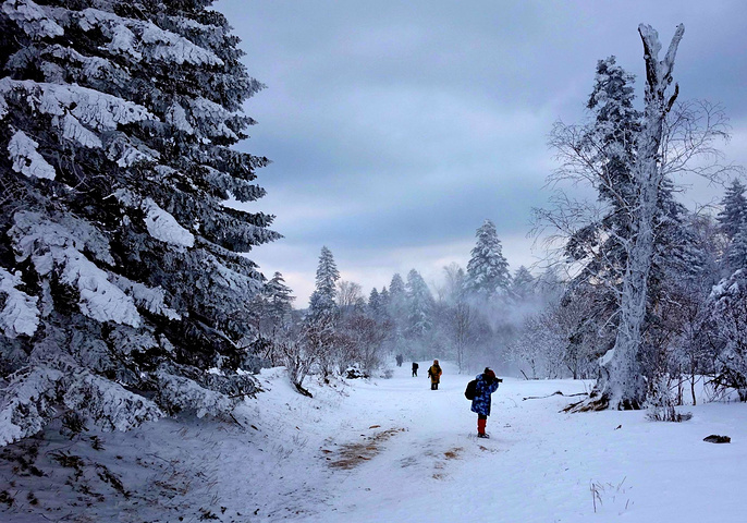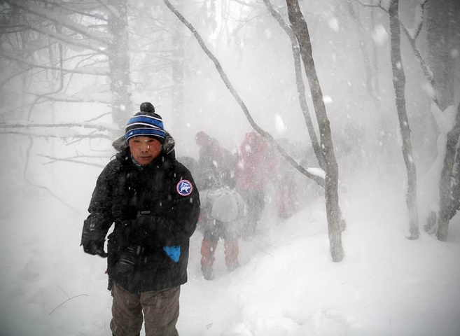 团友们开始穿越雪岭。长白山雪岭的真正的名字叫老爷岭或先锋岭,位于吉林省延边朝鲜族自治州境内的和龙市与安图县的交界处。因海拔高(1457m)、降雪量大,故被摄影爱好者称为雪岭。