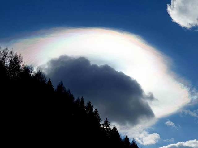 从二道白河的奶头河山庄去长白山雪岭,大约一个半小时的车程。途中有人发现天空出现彩云,于是停车拍照。